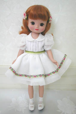 ![]() ドレスがとにかく素敵なので、分解してご紹介。 白いパフスリーブはオーガンディー素材、胸元にはタック、透明の小さなボタン。 このパフスリーブにウエストから広がるギャザースカート、その上にエプロン、というファッションこそが、 タイニーベッツィーのスタイルの王道のような気がします。 真っ白な靴も新鮮で嬉しい。 ![]() このリボンはMAの「Teddy Bear Tea Party Set」の子とそっくり! っていうか同じ?アメリカの流行なのでしょうか〜? この髪飾りはゴムで結んであります。![]() さあ、劇場へ出かけましょうか。 (2004.2.16) |